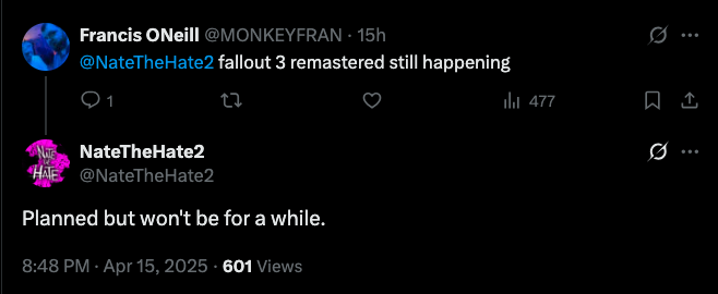 Industry insider NateTheHate2, who previously nailed aspects of the Switch 2 reveal, replied to a question on X about whether Fallout 3 Remastered was “still happening.” The answer was that it’s “planned but won’t be for a while.” There was no other info provided, such as what developer might be tackling the reported project. Fallout 3 originally came out in 2008 on PC, PS3, and Xbox 360.