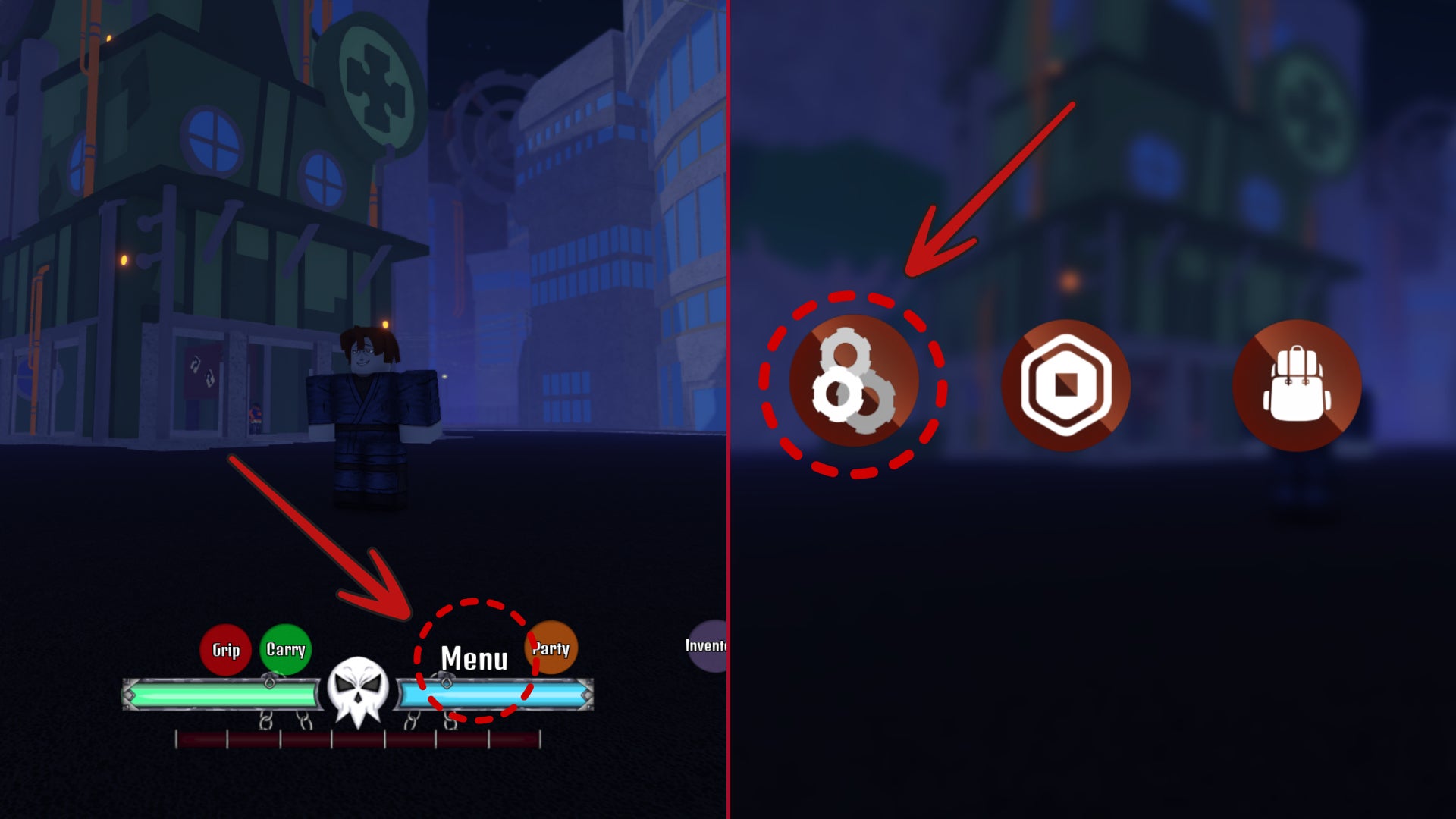 - After loading into the game, look at the hud in the centre of the screen. Above the health bar, you’ll see four buttons. Click the menu button. It’s circled in the left-hand side of the image above.