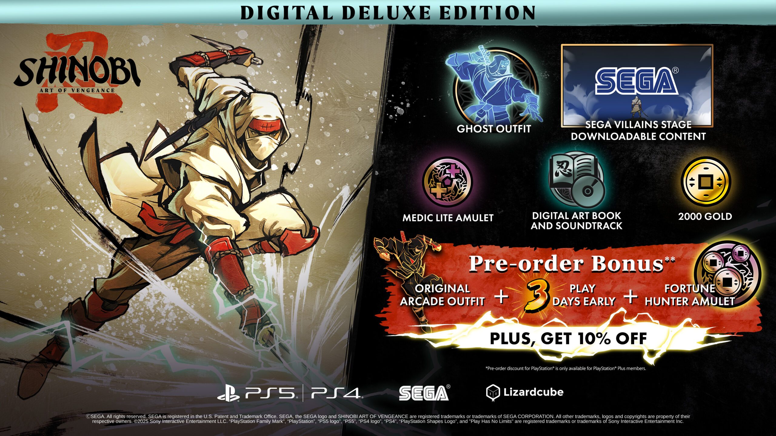 You can currently pre-order SHINOBI: Art of Vengeance on the PlayStation Store! Pre-order before 12:59 PM on August 29 (JST) to get 10%* off your purchase! The Digital Deluxe Edition is also available for pre-order, which includes the base game, a Starter Pack filled with in-game items, the SEGA Villains Stage (releasing early 2026), which features bosses based on iconic SEGA villains, Digital Art Book + Soundtrack.