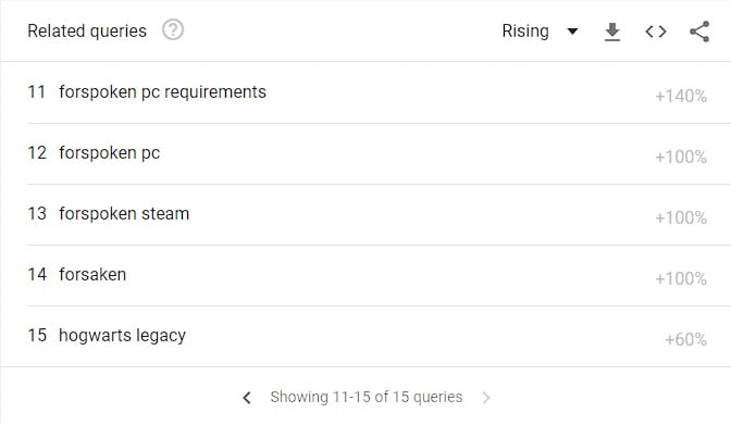 Analyzing how people are searching for Forspoken on Google Trends, the word “forsaken” (as shown above) has been labeled a related query on Google and is being searched about twice as much in recent days. Moreover, people are also typing in “forsaken video game”, “forsaken game”, “forsaken release date”, and “forsaken ps5” into the search bar, making it clear that the game’s name is giving a good portion of us a hard time.