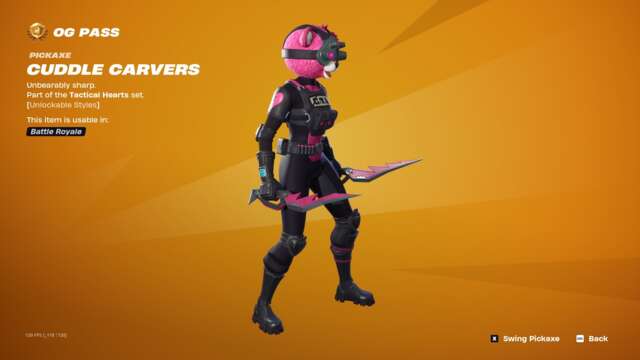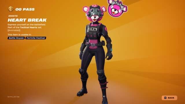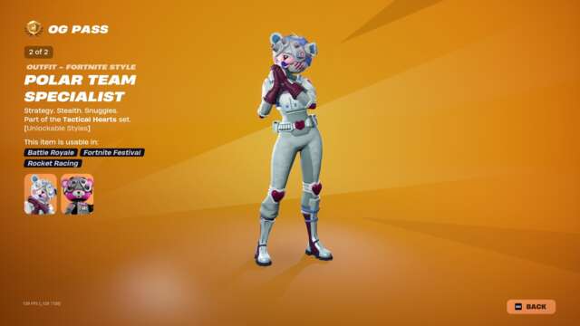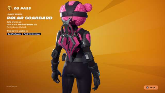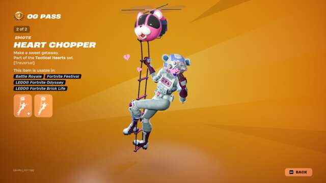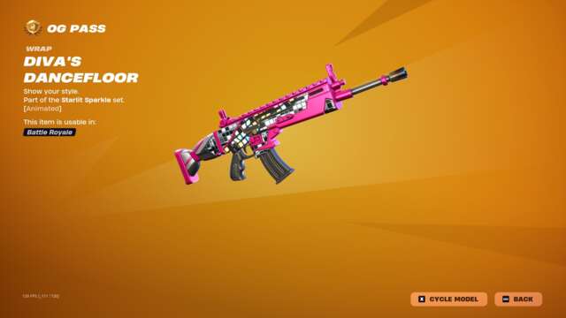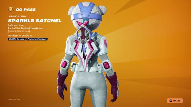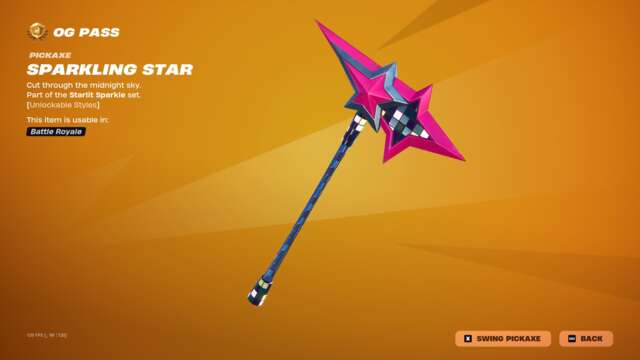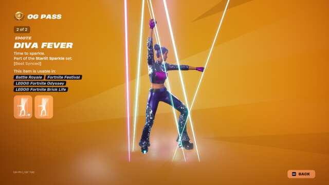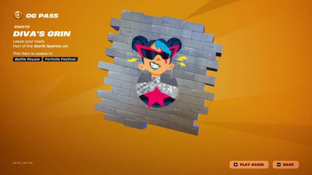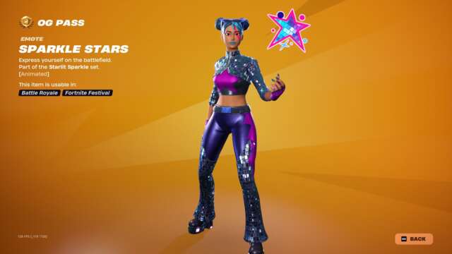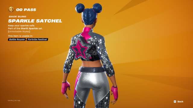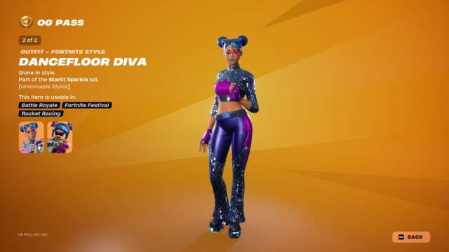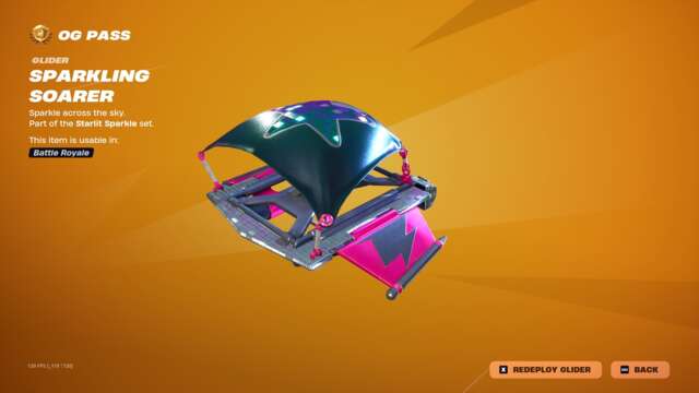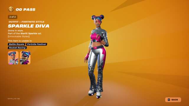 The new Spark Diva skin unlocks instantly when you buy the skin or unlock it via Fortnite Crew, and the highlight may just be that character’s glider: an old, default-style glider covered in sequins that plays a song while you ride. This pass has all the bells and whistles you’d usually expect: back blings, pickaxes, gliders, emotes, emoticons, sprays, and so on that match with all three skins.