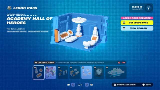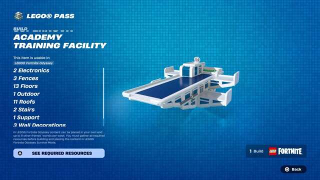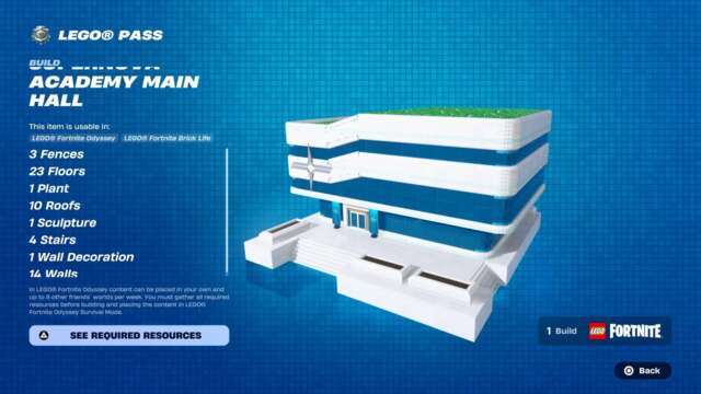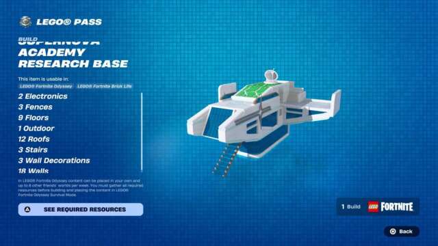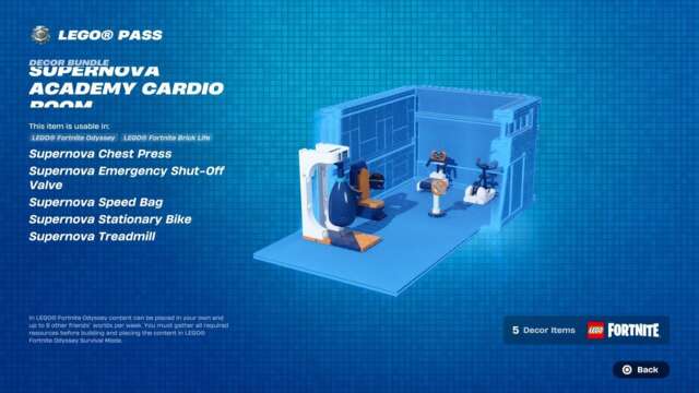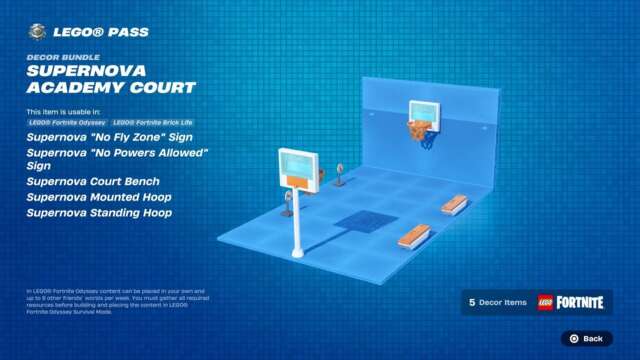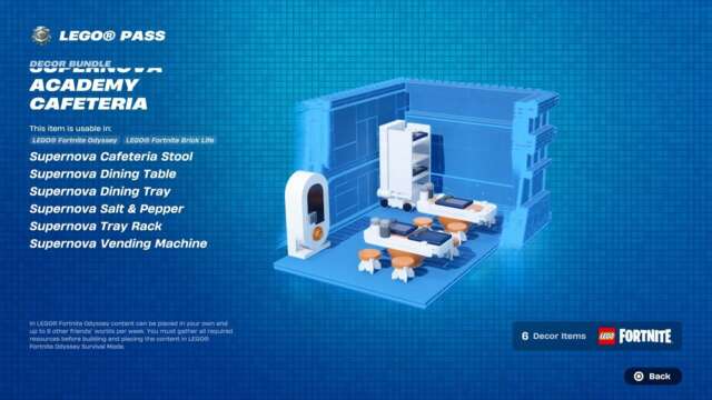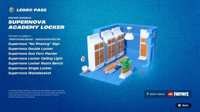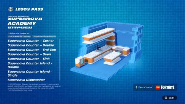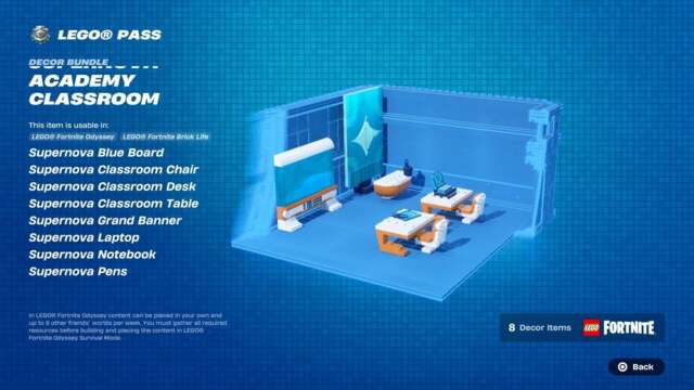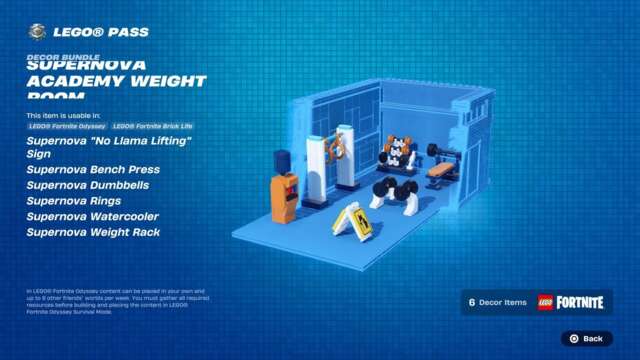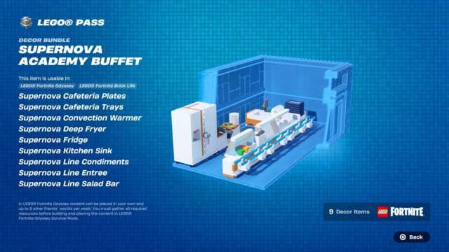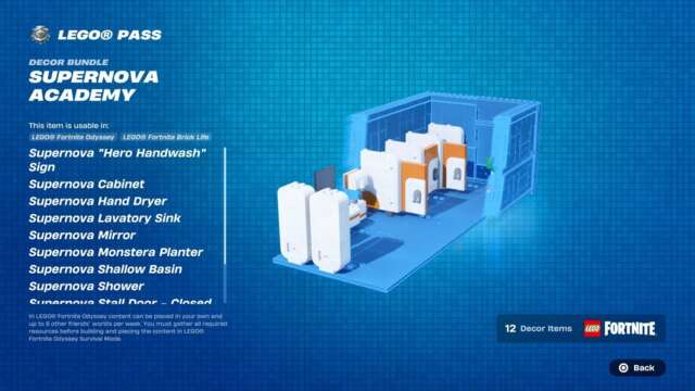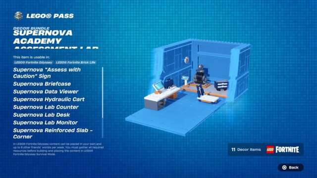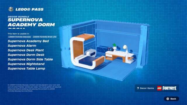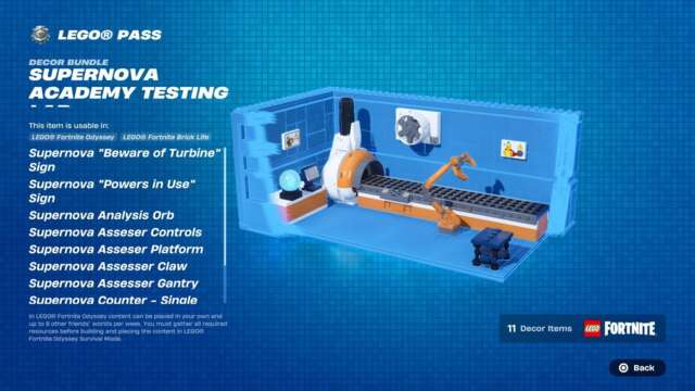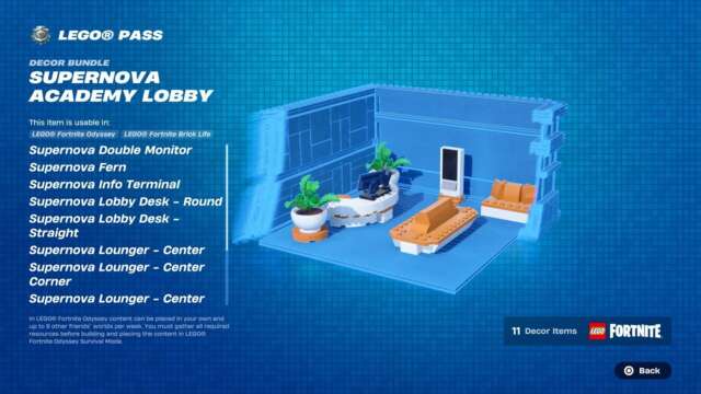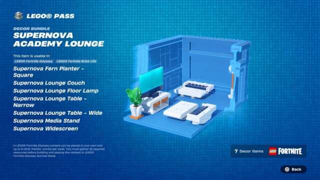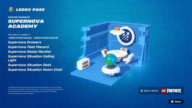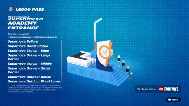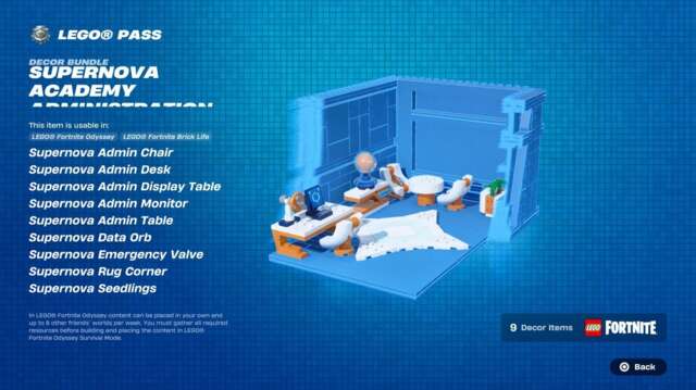 The Supernova Academy Lego Pass can be purchased for 1,400 V-Bucks or with a subscription to Fortnite Crew. As to be expected, this pass is mostly full of Lego builds and decor items that you can use in Lego Fortnite Odyssey or Brick Life. Some of the decor bundles include the Supernova Academy’s main hall, research base, and training facility.
