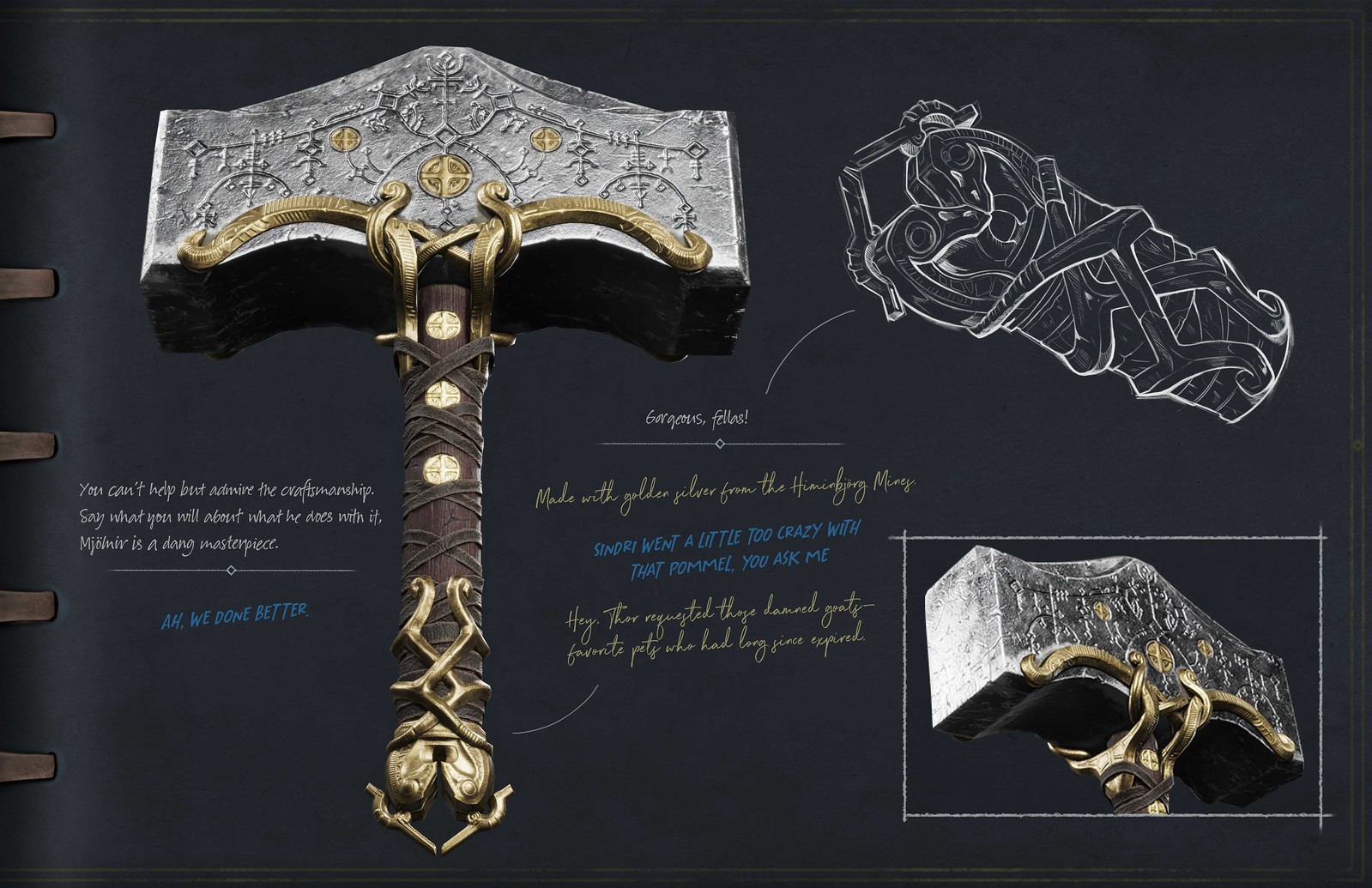 Artist Yefim Kligerman designed the hammer for the post credits scene in God of War (2018). Even back then to visually connect these two iconic weapons, Yefim included a runic skill tree etched into the face of the hammer in the same manner we find on the blade of the Leviathan Axe. This way we can see the signature craftmanship of Brok and Sindri in both weapons.