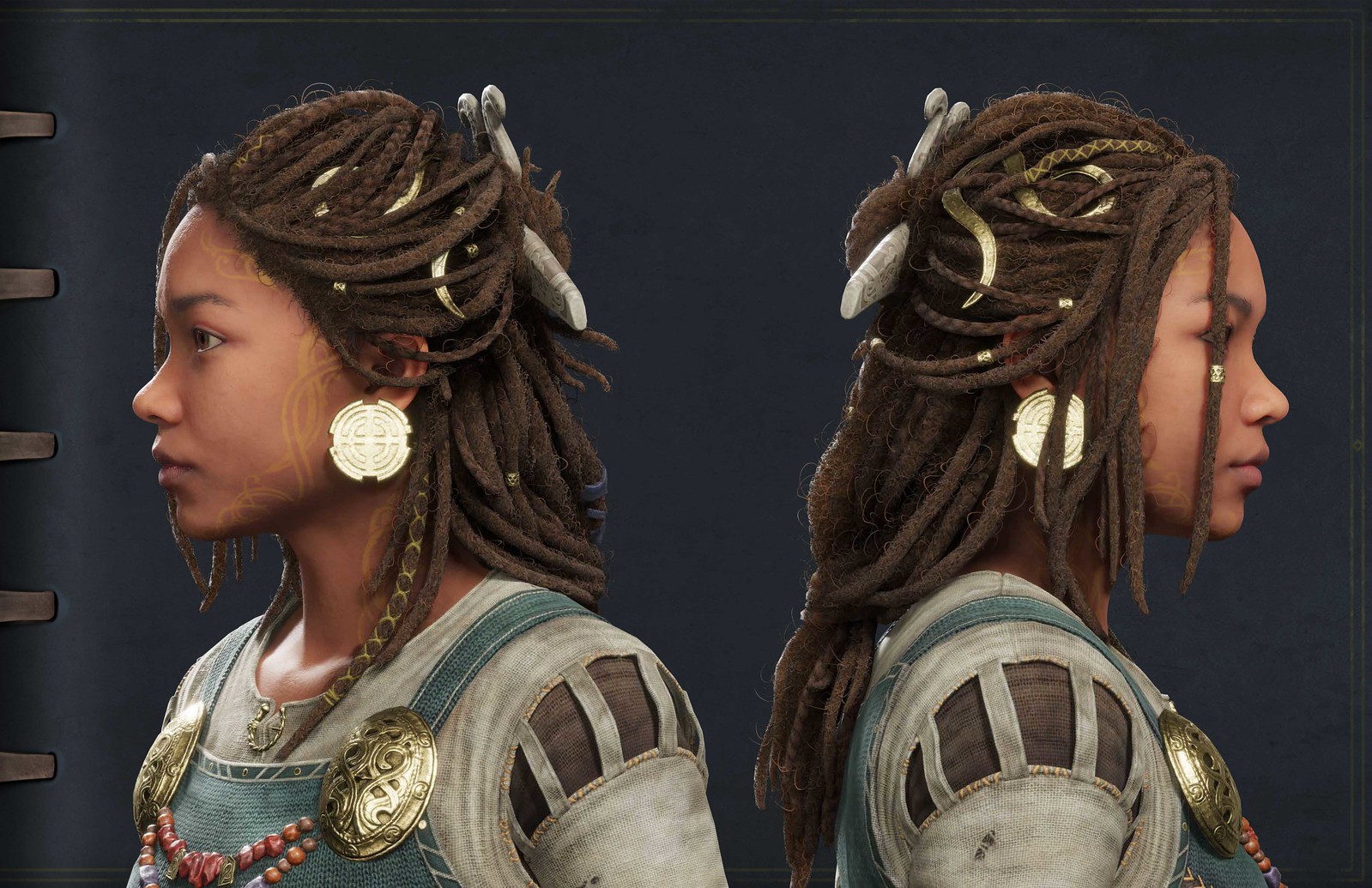 For example, Atreus’ new look features a huge splash of yellow to honor his Giant heritage and connection to his mother. Angrboda, while being a Giant and living in Jötunheim, has clothing that features mostly shades of browns, teals, and grays. While her primary clothing pieces don’t have the same statement yellow piece that Atreus’ does, we still wanted to include smaller touches of the color to show her ties to the Giants and to Atreus.
