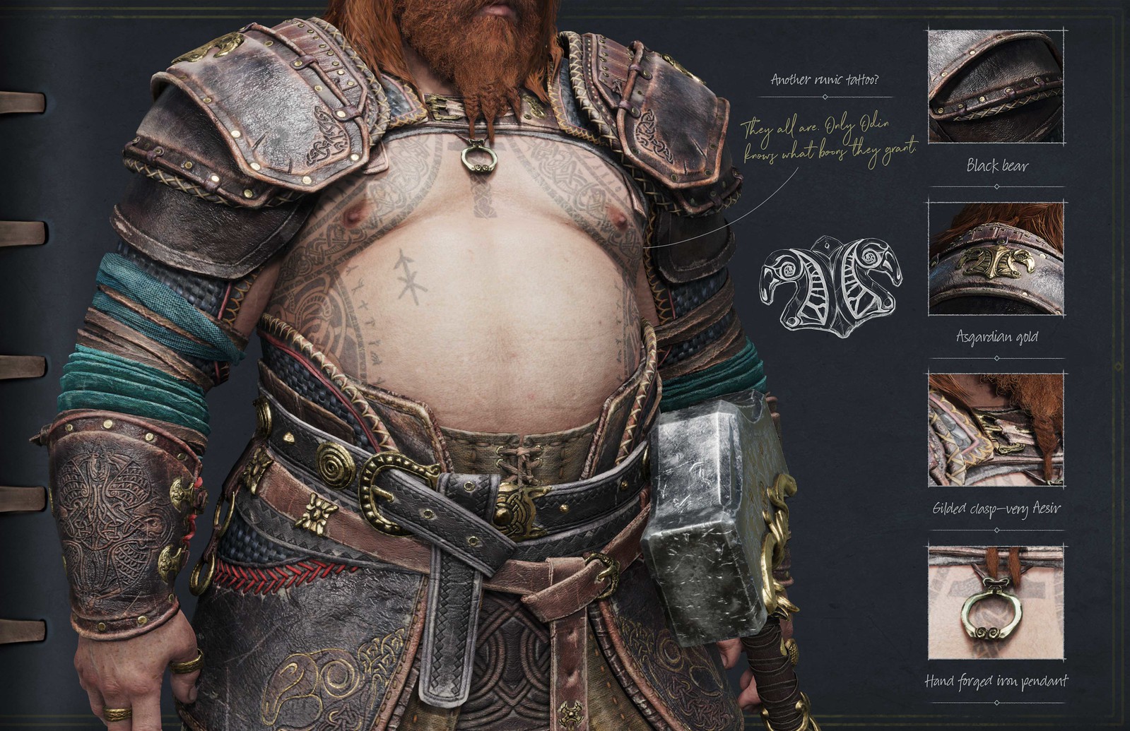 Along with making sure we get the overall look we want for any character we also enjoy layering in small hints and design details.  Thor’s goats, Tanngrisnir and Tanngnjostr, make an appearance in the bottom gold carved cap of Thor’s hammer. Keen-eyed players and cosplayers will also notice there are other goat motifs reflected in his design.