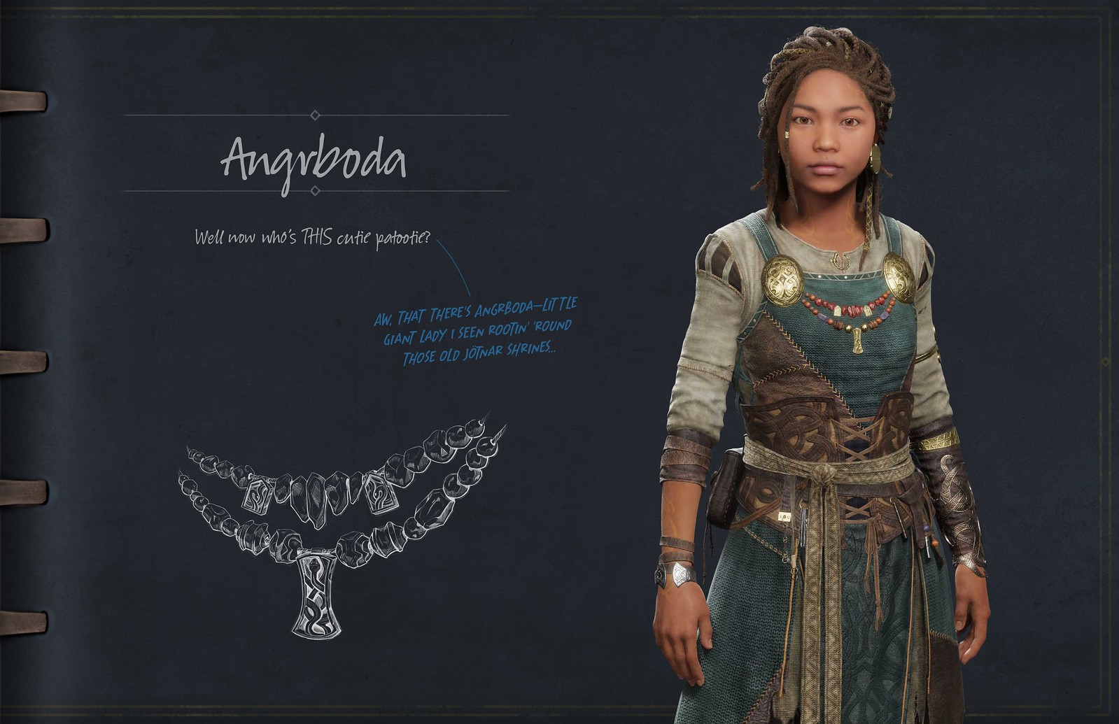 While we were able to visit Jötunheim at the end of the last game and saw parts of their culture represented through Faye’s art and the triptychs, Angrboda is the first Giant we meet that is actually from Jötunheim and currently calls it home. What were some of the key elements you wanted to include in her design to show visually how the Giants are unique from the Midgardians and Aesir?