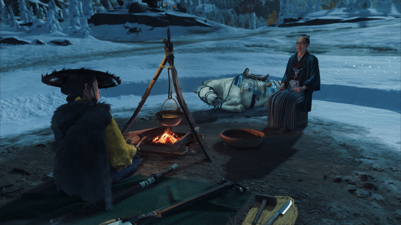 The combat one was like… look at 13 Assassins. That was our number one reference point, or at least one of the top reference points for Ghost in general. Ghost of Tsushima? 13 Assassins. Ghost of Yōtei? There’s some 13 Assassins stuff in that, too. Improvisational sort of fighting, grabbing weapons. That style of combat is a massive reference point. We reached out to Miike. He was super stoked. We had a really great conversation. He’s such a cool, creative individual. He’s even got a sword kit in the game players can find. It has a special name. He named it, and so it’s very, very exciting.