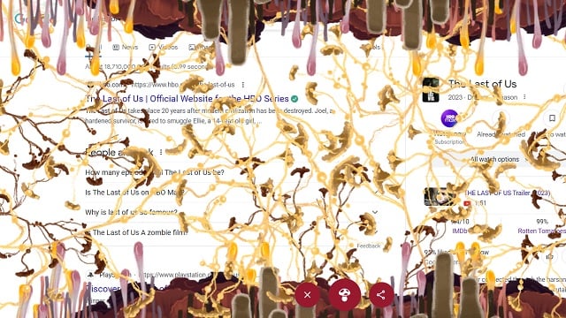 When users search for The Last of Us, an icon with a mushroom appears at the bottom of the page. Clicking on the mushroom repeatedly will result in what looks like fungal growth taking over the browser screen. Here’s what your screen will look like: