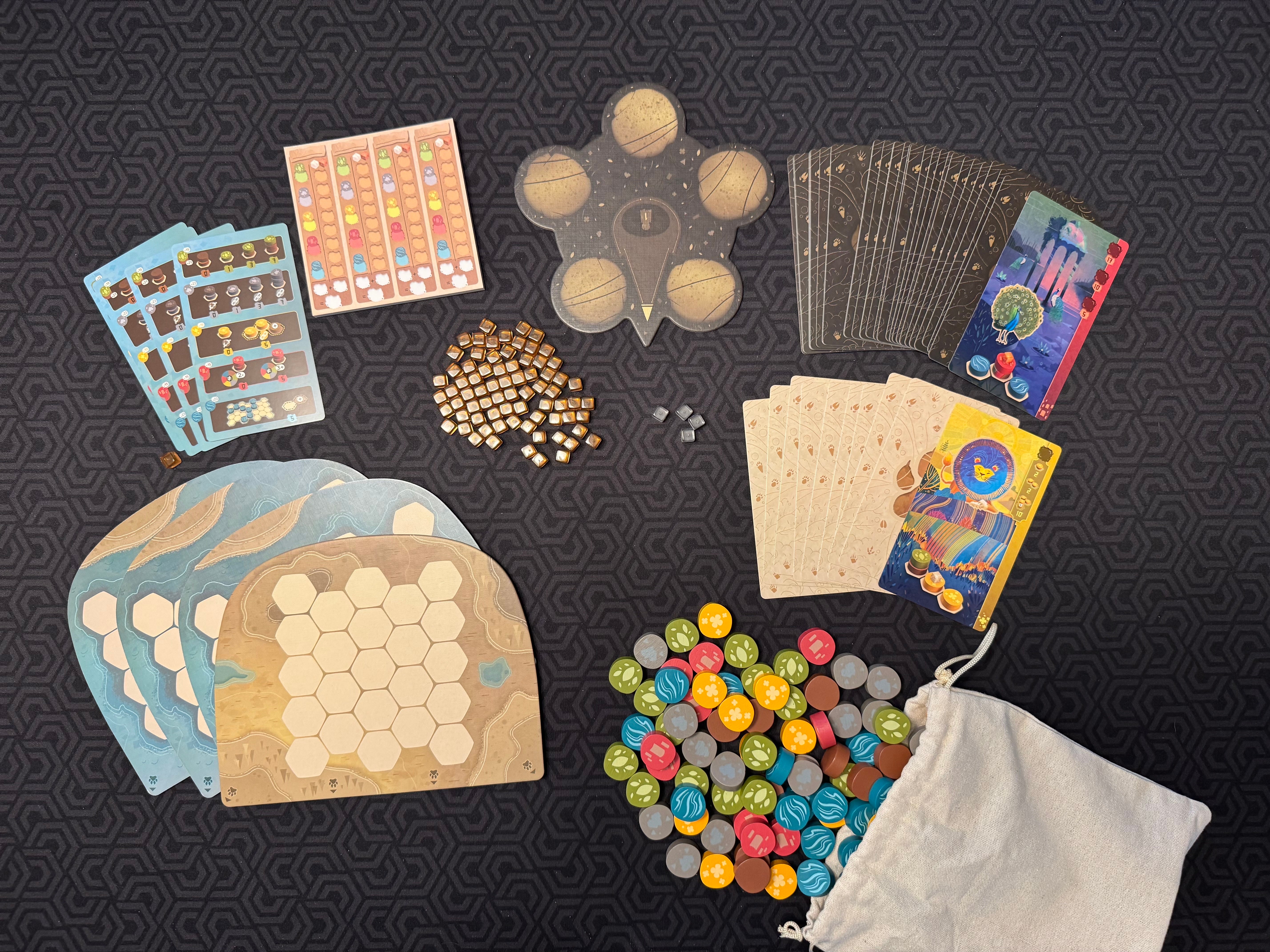 Beneath the instruction booklets are four sturdy, double-sided player boards and a double-sided central board used for drafting tokens during gameplay. Each set of colorful wooden tokens comes packaged in its own plastic bag for organization during shipping, but you’ll likely find it easier to store them all together in the included linen drawstring pouch. The tokens themselves are high-quality, surprisingly lightweight, and make a satisfyingly tactile sound as they rattle around in the bag.