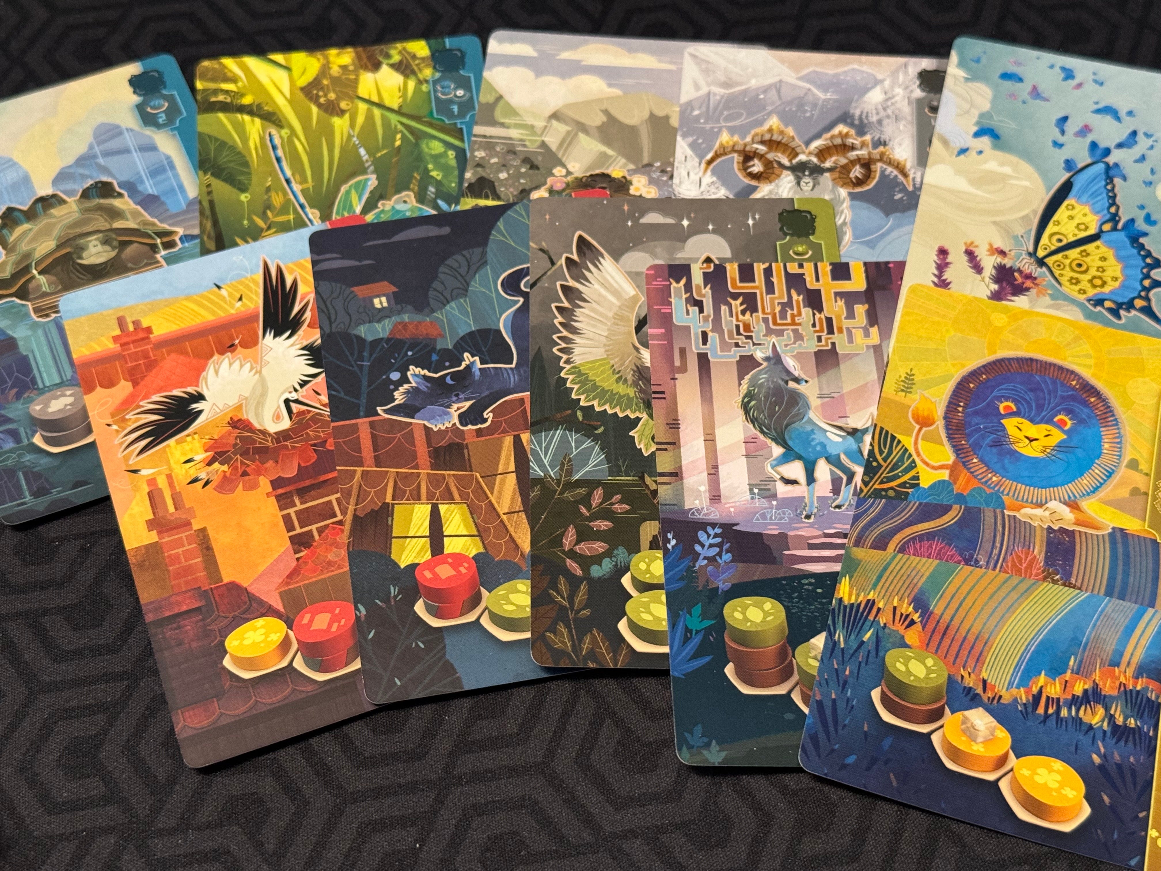 Once you’re comfortable with the base game, there are a few optional elements you can add in to shake up the gameplay. The first is the inclusion of Nature’s Spirit cards. At the beginning of the game, each player drafts one of two cards, each of which tasks you with building and completing a specific habitat in order to unlock an alternate scoring method for a particular biome. For example, you might earn extra points for building larger clusters of a specific terrain type, or for reaching certain heights with mountains or trees. These cards introduce new scoring opportunities and encourage you to rethink your usual strategy.