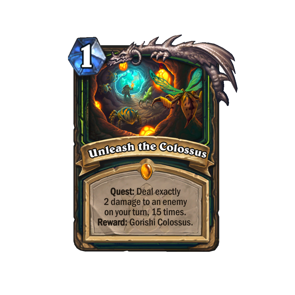 For those unfamiliar, Hearthstone quests are 1-mana spells that always start in your hand, and give you big rewards for completing their objectives. Demon Hunter’s quest, Unleash the Colossus, challenges you to deal exactly two damage to an enemy on your turn, a whopping 15 times.