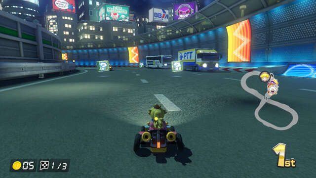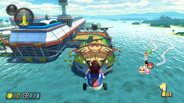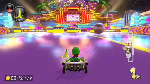Sometimes Mario Kart tracks just take place in random areas that make us think the world of Mario has advanced infrastructure. Take Sunshine Airport, a track that envisions shutting down all Mushroom Kingdom air travel so that you and your friends can do go-karting. The runway makes a nice wide-open track while the parked airliners serve as both obstacles and track pieces. Massive windows inside the airport make the whole thing look nicely lit, and there are tons of little details like the baggage claim area to give it just that tiny bit of added character.