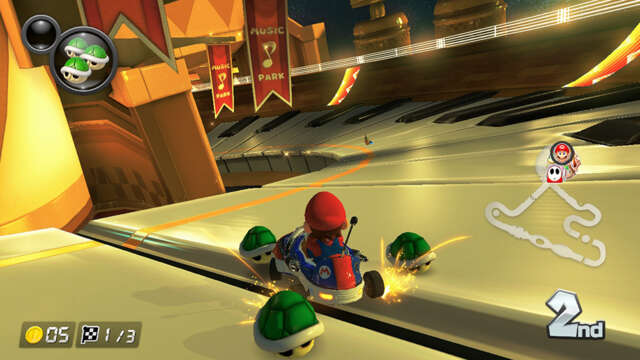 On the other end of the spectrum, Music Park is a fantastical location that doesn’t even pretend to be analogous to the real world. You’ll race across piano and xylophone keys with the music corresponding, navigate around bouncing musical notes, and bound across drumheads. It’s a wildly creative track that really makes use of the concept.