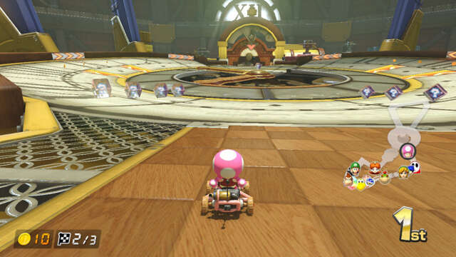 Did Mario and his pals shrink or is this just a really big clock? Either way, it’s a creative idea done well. The track design gets a lot of mileage out of moving parts like gears, and the whole thing is painted in gold and bronze tones to really sell the feeling that you’re go-karting around an old grandfather clock. Hazards like a swinging pendulum and a working clock face that could block your access to boost pads makes it one of the absolute best.