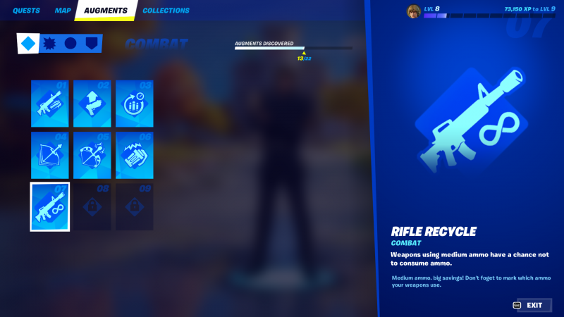 New to Fortnite is the Augment system, which grants players powerful, randomized perks every few minutes they stay alive in a game. For example, augments can spawn in certain weapons, give vehicles unlimited fuel, or allow you to regenerate a specific type of ammo. Playing more will also unlock new augments over time, so pay attention to the unlock screen when you return to the lobby at the end of a game to see if you received any new ones.