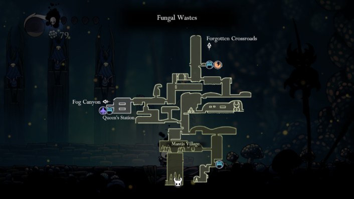 - The Knight is going to come across a Fungoon on the right. Continue down the right gap, then turn back to go down another. Use the small platforms to guide you along the path. The Knight will run into a Sporg on the left. Drop down to the bottom of the right-hand gap, where the Knight will locate another Sporg. Turn left and continue down the path via the two little platforms.