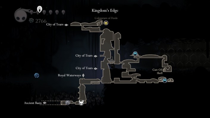 - Then, exit the Tram, and the Knight is now in the southwest corner of Kingdom’s Edge. Go to the right, where there are spike pits. Jump and dash (Mothwing Cloak ability) or double jump (Monarch Wing’s ability) above the spike pits and towards the safe platform on the right.