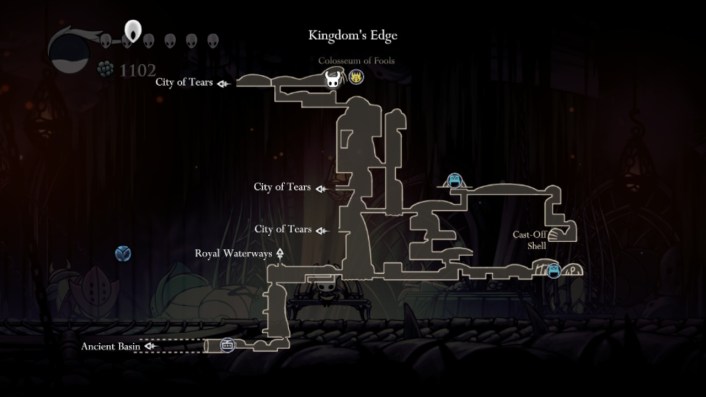 To reach the Colosseum of Fools, the Knight must first have Isma’s Tear ability. This ability allows the Knight to swim safely in pools of acid. It is also recommended that the Knight has the Monarch Wings ability. This ability enables the Knight to jump mid-air again. En route to the Colosseum, the Knight will encounter Booflies, Primal Aspids, Belflies, and Hoppers.