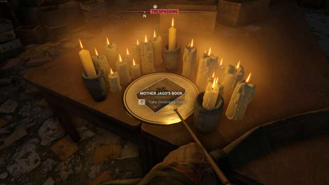Eventually, after climbing a hill with grassy weeds and crumbling castle walls, you’ll come to a larger area with a hole in the ceiling that’s causing light to shine in. From this area, head up a staircase into a library, where you can find Mother Jago’s Book sitting on a back table surrounded by candles.