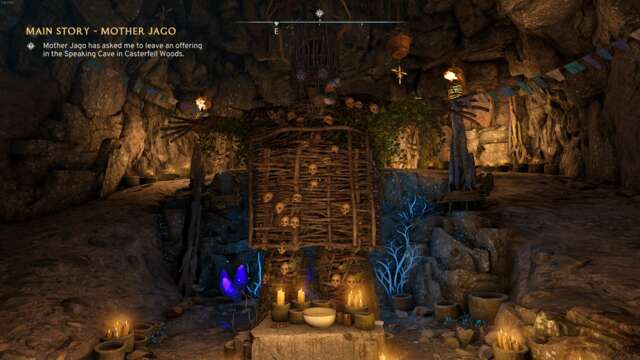 The Speaking Cave is located in the southern part of Casterfell Woods at coordinates 23.0 E, 85.4 N. Here, you can enter the cave freely, as Mother Jago has given you an item that makes you a friend to the Druids. Inside the Speaking Cave, follow your quest marker to head up to the end of the winding paths. The paths culminate in front of a large, wooden structure with a bowl placed on a table under it. Approach the bowl, interact with it, and place an offering inside of it.