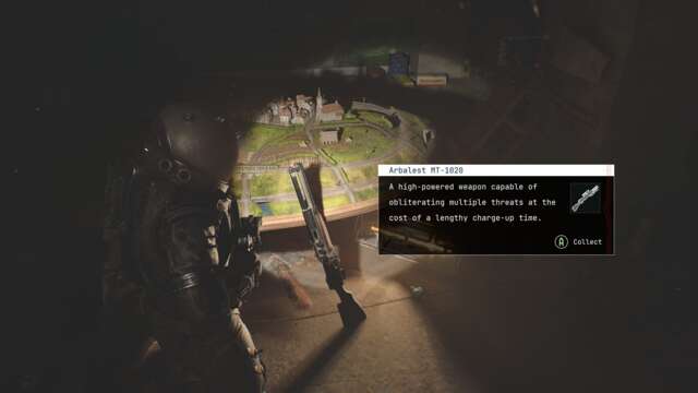 The Arbalest, which looks like a sniper rifle but functions more like a rocket launcher, can be found in the tram station while preparing to go to the Church Abbey, after the hospital sequence. On your way to the second of two generators, you will enter a small plaza with a Christmas tree. There are two doors here; one is a locked door leading into a toy shop, the other leading you into a safe room, where you can see a white cat on the other side of the glass. The cat has the Toy Shop key, so you need to reach them. You will need the bolt cutters.