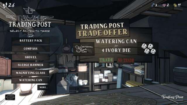 The Trading Post lets you exchange various items that you’ve found to receive Ivory Dice. You can get anywhere from one die to around four depending on the item/tool that you hand over.