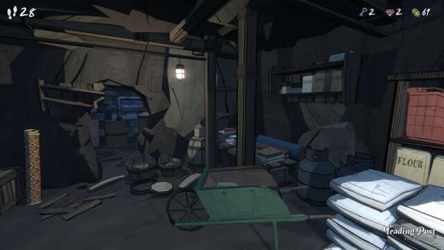 To access the hidden nook, you need to use the Burning Glass or Self-Ignited Torch to light the dynamite in the Trading Post. The wall will blow up, revealing a distillery.