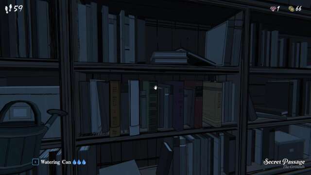 - Since the Watering Can has Still Water, you should see a prompt to interact with the bookcase. Do this so you can pull the blue book that appears.