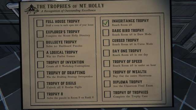 The Explorer’s Trophy, meanwhile, requires you to advance through multiple days, all while drafting every single applicable room in the mansion. Basically, you must have access to every room in the Room Directory in your menu. Here are a few tips: