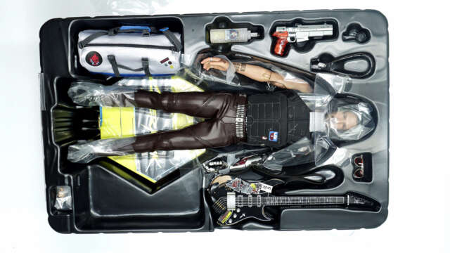 You don’t need too many accessories for your Johnny Silverhand, but Hot Toys has definitely included the right extras for this figure. Out of the box you’ll get his signature gun, a bottle of liquor that is surprisingly still full, a wristband, sunglasses, Silverhand’s dog tags, and a duffel bag that has several Samurai band patches on it.