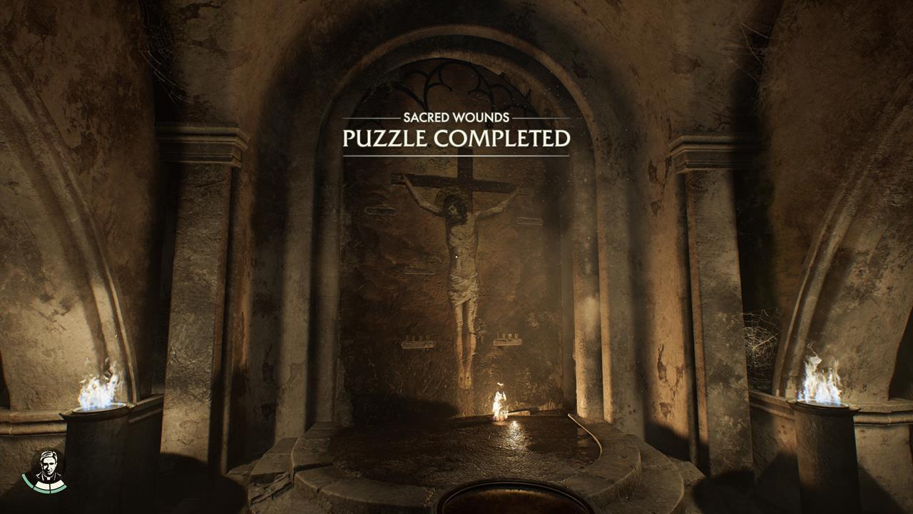 All you need to do is move the latches in the central wall where Christ is crucified depending on the wounds/body parts and the Roman numerals. Look directly at the puzzle wall itself and use the solution below for each latch: