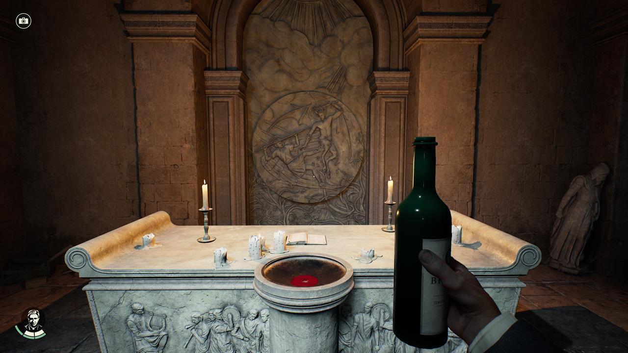 Once inside the building, pour wine in the basin in front of the altar. Then, interact with the bas-relief and rotate it to the left, which shows the angel skewering the demon from above. This will reveal a hidden stairway to the underground section.