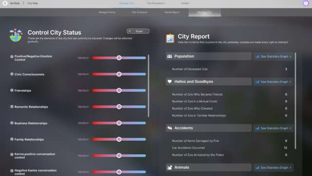 In The Sims, you have basically unlimited freedom to mess with any property lot in the game, but you can’t touch anything else–outside of lots, the many worlds of The Sims 4 are set in stone. InZoi goes the other direction, allowing players to mess with their cities as much as they want. You can use build mode anywhere you want, placing food trucks all over town so you’re never far from an emergency meal, for example. And in the Edit City menu you can make global changes, like filling your town with (peaceful) crocodiles or making it very dirty–or you could make your neighbors super mean or super nice. In The Sims 4, a lot of this stuff would be impossible even with mods.