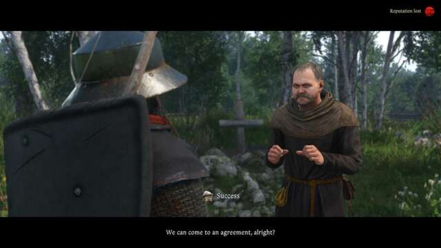 Neither the Persuasion nor Impression responses worked in our playthrough, so we had to rely on Intimidation. Henry’s remarks scared Jakesh out of his wits, causing him to agree to a reconciliation. When you’re done, return to Bozhena to tell her of the news. You could also hand over 150x Groschen as Jakesh’s payment for the trouble that his hired hands caused.