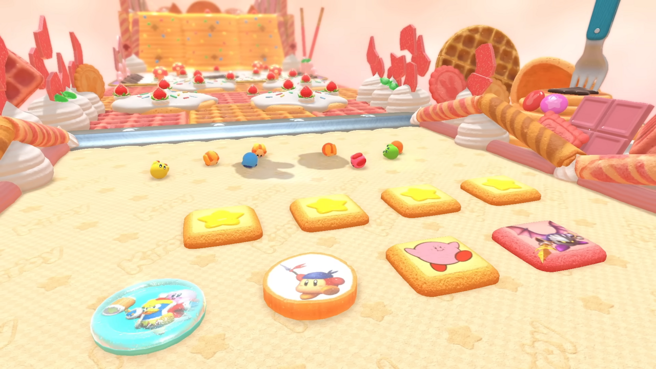 Kirby’s Dream Buffet begins atop a table adorned by pastel-colored pastries and sweet treats. After rolling off your plate and onto the gingham-patterned tablecloth, you can browse through a variety of supplemental features or roll straight on into one of the game’s three play modes: Battle mode, Online mode, or Local Play mode.