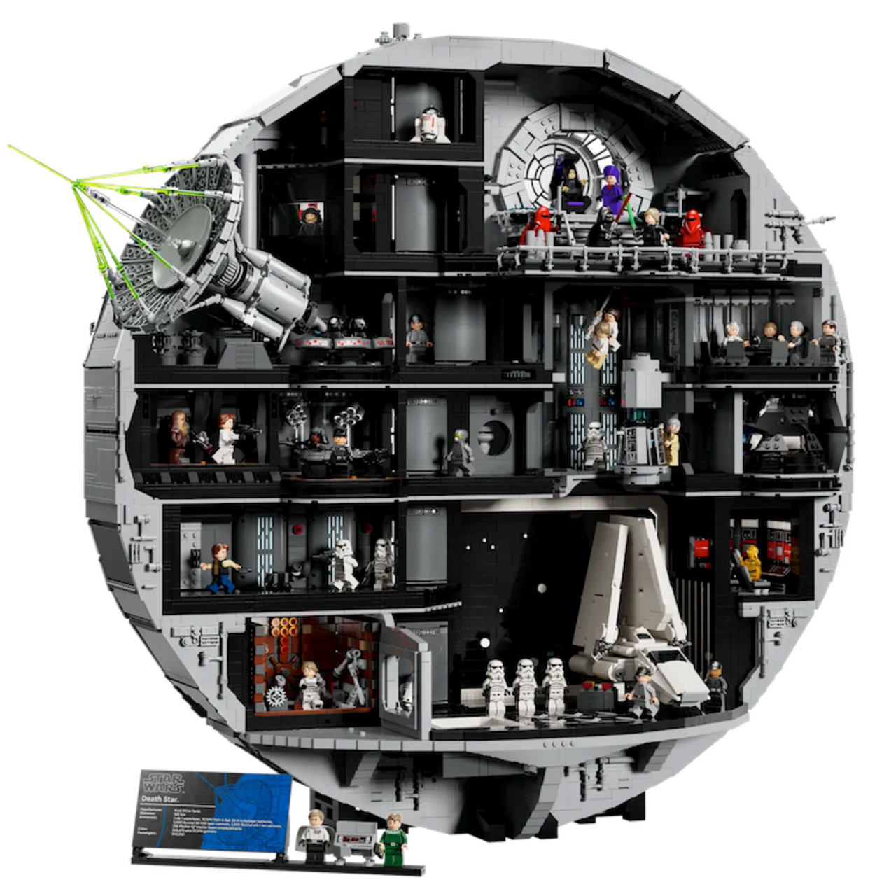 There’s plenty of room inside the Death Star for all of those figures (and more). Once fully assembled, the UCS Death Star is 27.5 inches tall, 31 inches wide, and 10.5 inches deep.