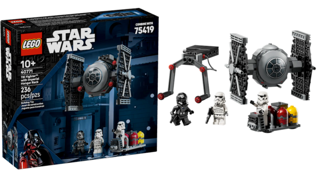 The TIE Fighter can be displayed on the Death Star’s hangar wall. Along with the starfighter and rack, the 236-piece kit includes a service cart and three minifigures: two Stormtroopers and one TIE Pilot. The freebie is only included with the purchase of the UCS Death Star from October 1-7.