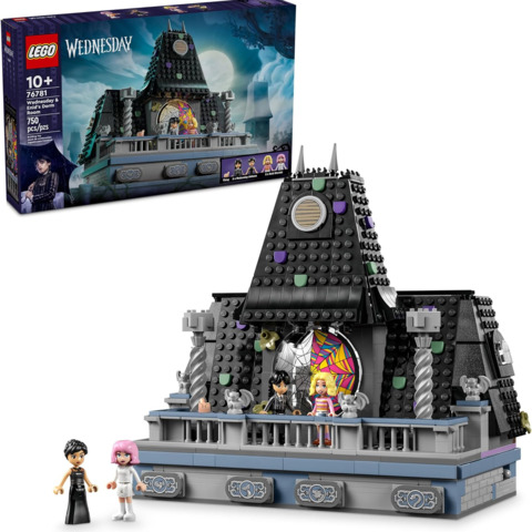 This is a 750-piece set that includes a buildable dorm room with a spiderweb window that opens, a base with buttons that open secret drawers, and a balcony with four gargoyles. It also comes with four minifigures–two versions of Wednesday and Enid–alongside different outfits, wigs, and facial expressions for them.