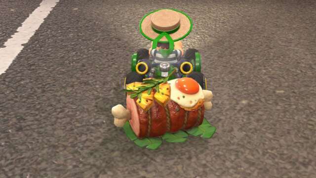 When I think of a cartoon meal, one of two images pops into my head: a big brown turkey (typically reserved for a Thanksgiving episode/special) and the baked ham featured in Mario Kart World. The thing looks outstandingly juicy, the egg on top is begging to be gobbled up, and while I’m no pineapple lover, the tasteful placement on this ham versus the arrangements I’ve seen on actual Hawaiian baked hams leaves me open to the idea of eating this one whole. Bone and all.