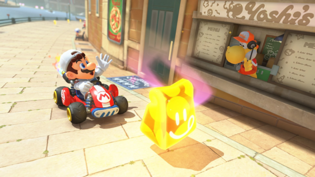 Dash Food also largely fits the vibe of the locales they’re in. Spending some laps circling Koopa Troopa Beach? Grab a delectable fruit salad! Heading up to the Japan-inspired Cheep Cheep Falls? Enjoy some Takoyaki and delicious-looking seafood platters. And when in doubt, a roadside Yoshi’s restaurant is bound to have some burgers to-go.