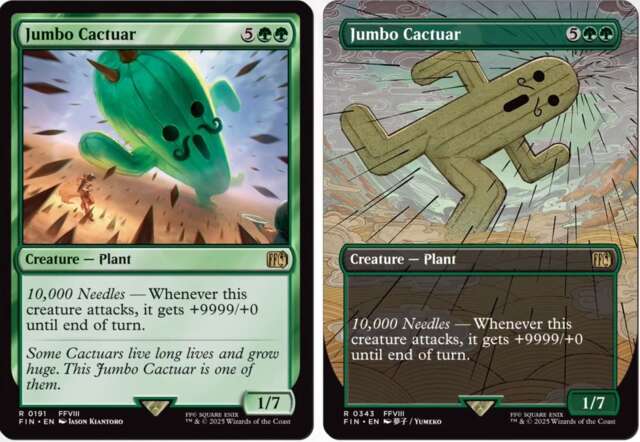 The Jumbo Cactuar comes in normal and special borderless art, and it can eliminate any creature every time it attacks.