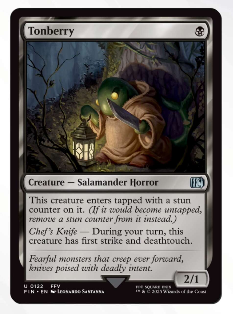The iconic Tonberry is a mono-black creature that takes an extra turn to get going, but when it does, any creature that steps in front of it will die before Tonberry takes any damage.