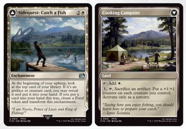 A new Sidequest subset of cards will start as enchantments, but once the “quest” has been completed, you can flip it for a different effect. Catch A Fish, for example, turns into a land.