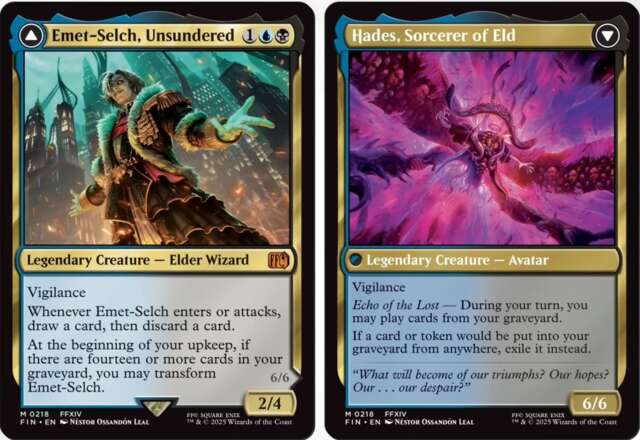Some character cards will be double-sided and able to transform after fulfilling certain parameters. Emet-Selch, for instance, can transform into Hades once the graveyard has enough cards in it.