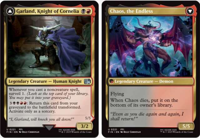 Garland, meanwhile, will transform into Chaos once the mana cost is paid. Before that, Garland is a powerful surveil creature that can rip through your deck with every noncreature spell.