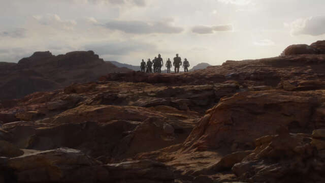 “Our people are scattered, like stars in the galaxy. What are we? What do we stand for?” Mando says this as we see a group of Mandalorians together–seemingly new members of the group we have yet to see on the series.