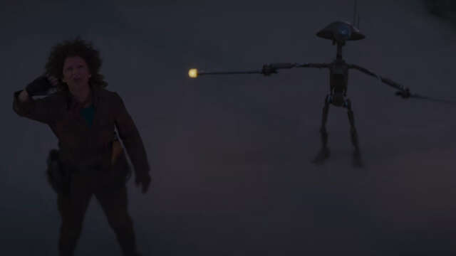 Mando and Grogu are on a new planet, checking things out. And if you look in the background, you’ll see a 3PO-series protocol droid–yes, the very same that C-3PO is. This is considered an older droid, as these models were built during the Invasion of Naboo–so during The Phantom Menace. These droids were created to be translators and are fluent in over 6 million forms of communication.