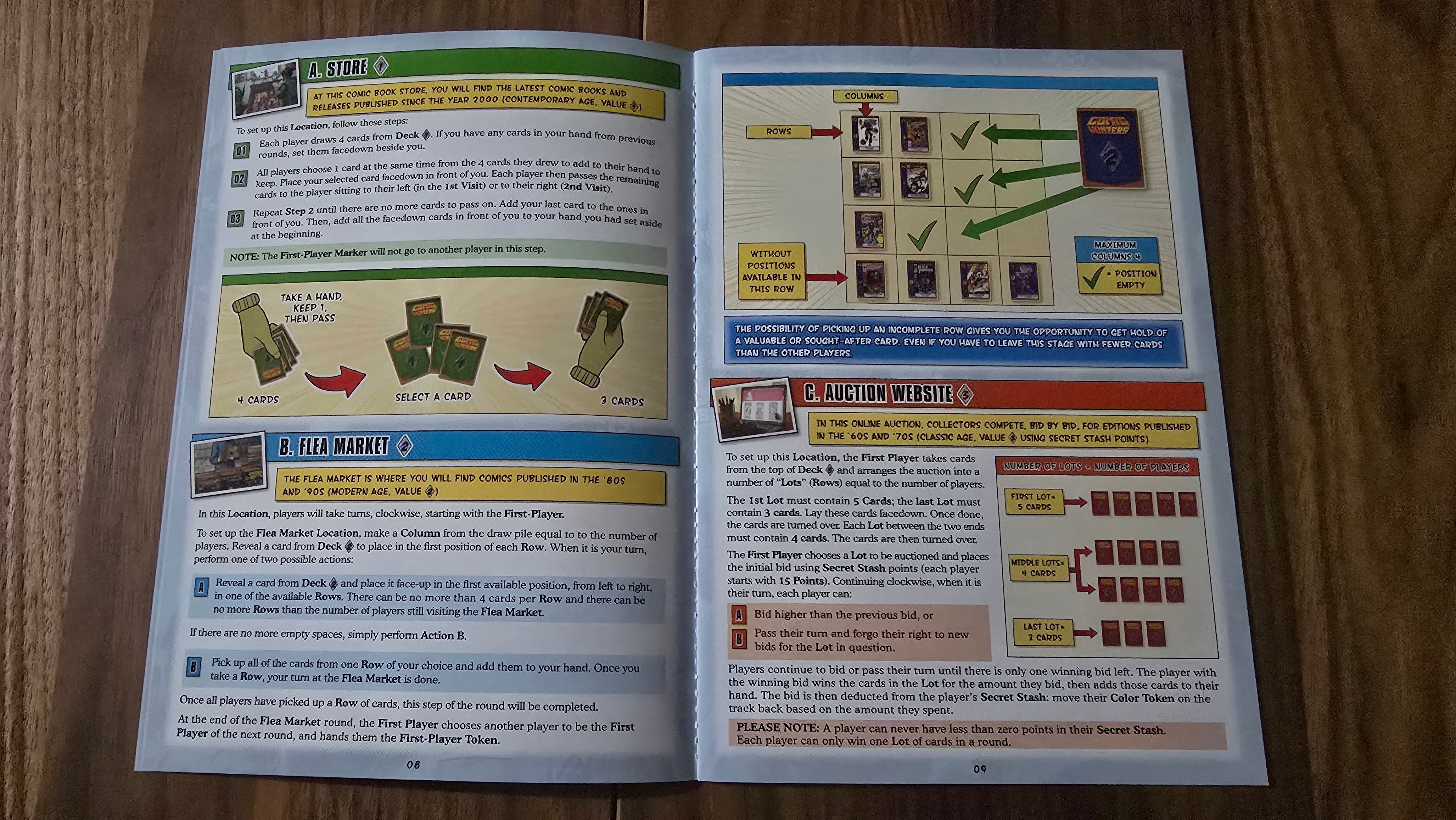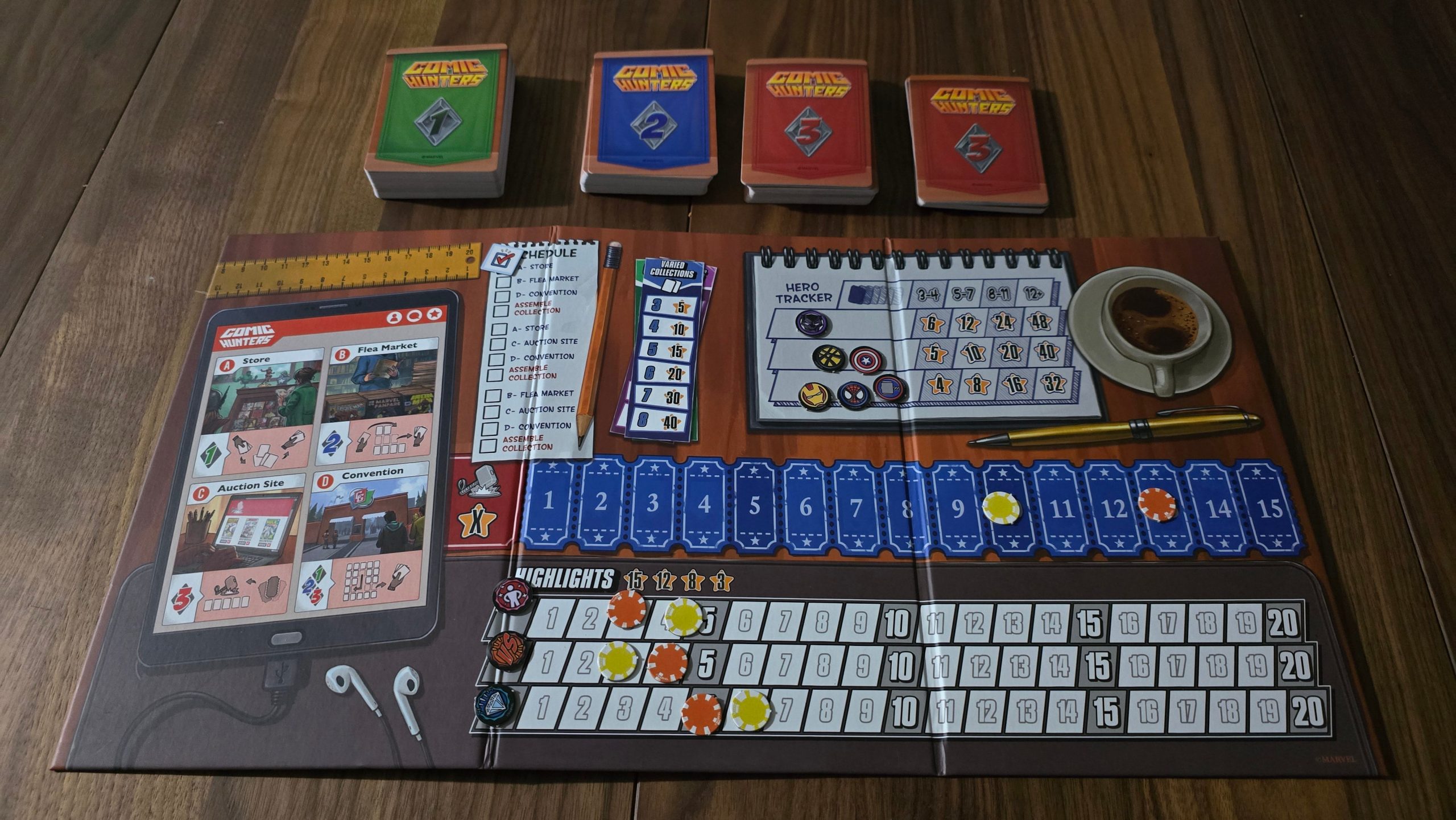 There are several avenues to score points come the end the game – the sets of hero comics you have, the types of issues you have, the star tickets you have left that you didn’t use during auctions – so depending on how many comics you’ve managed to get, counting up the various symbols and figuring out how to best organize your sets for the most points can be a bit of a chore. My best recommendation to alleviate this is to simply keep track as you play with tally marks on how much of any one type you have in a set at any given time and adjust after the end of each set-building phase.