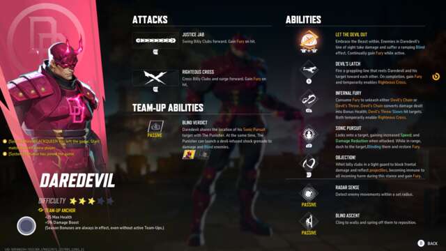 Blind Verdict (team-up): Daredevil shares the location of his Sonic Pursuit target with The Punisher. At the same time, The Punisher can launch a devil-infused shock grenade to damage and blind enemies.