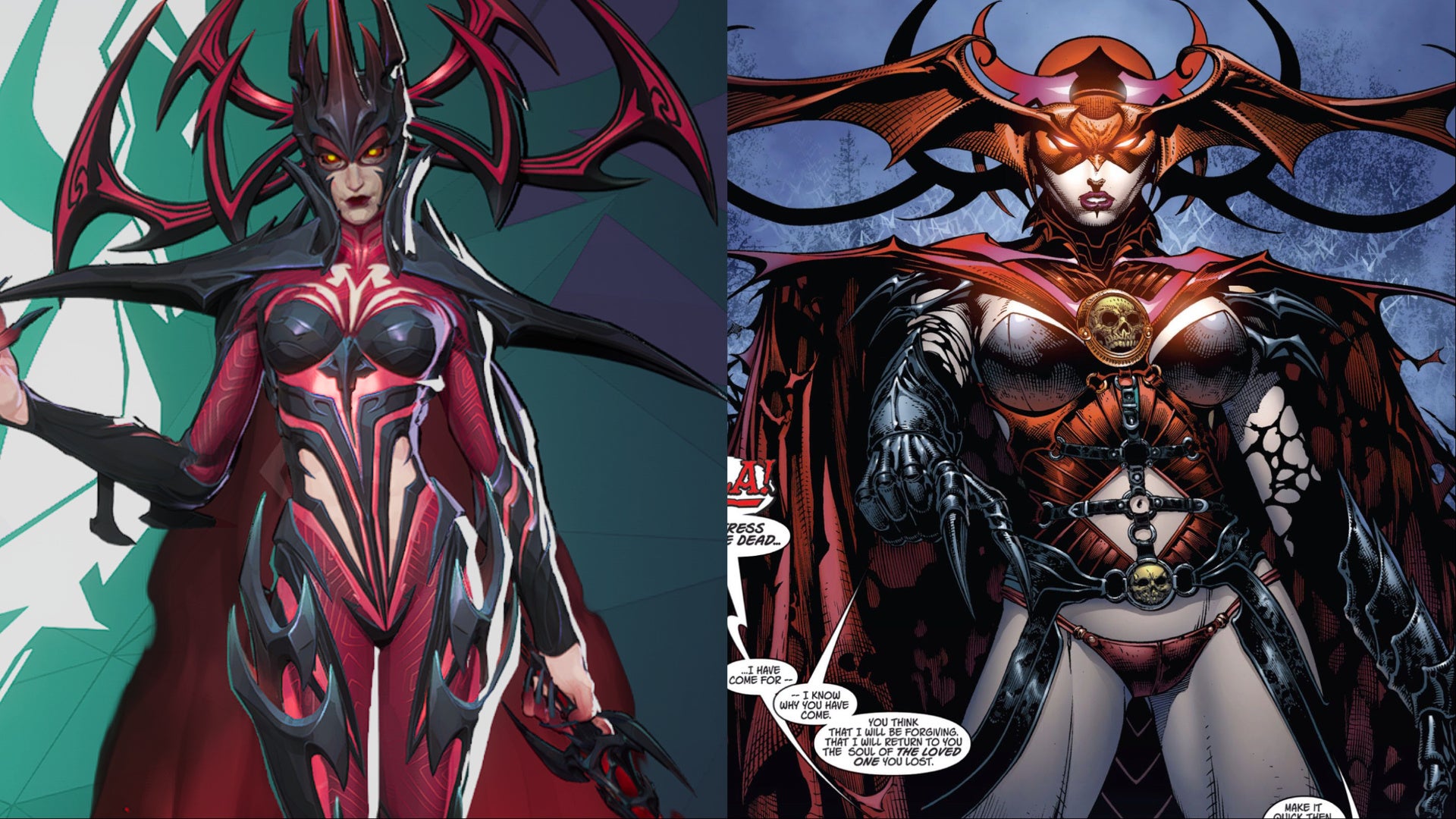 This skin is based on the version of Hela from the Ultimate Universe. This Hela is distinguished by her crimson-colored and much more revealing armor.